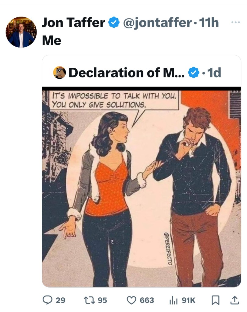 In my most favorite social media post ever, Jon owns one of his many competitive advantages by celebrating a self-deprecating meme, highlighting both his mental prowess as a problem-solver and his illustrious character as a human being.
