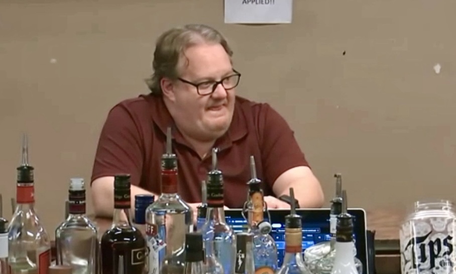 Jon admonishes Greg, pointing out that the bartenders are embarrassed because Greg didn’t train them and now they’ve been put on the spot. Jon takes a big sigh of disbelief and then heads over to the sticky table to try the pizza and his drink.